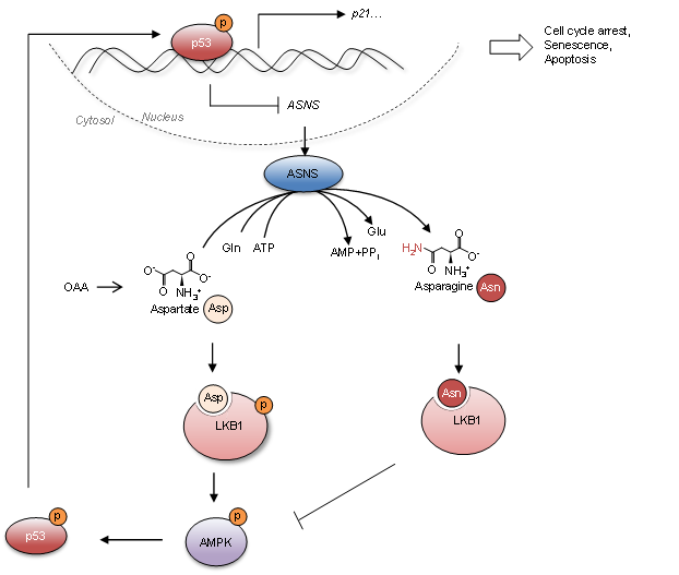 图1. p53与天冬酰胺代谢之间的反馈调控揭示了LKB1是天冬酰胺和天冬氨酸的直接感受器。