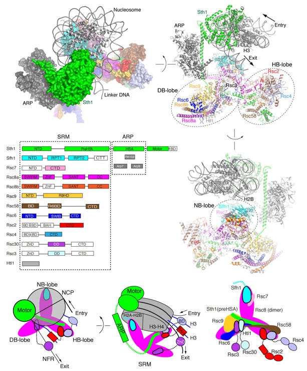 染色质是遗传信息的物质载体。染色质的形成可以有效压缩DNA以适应细胞空间的需要,但同时抑制了基因的表达。核小体是组成各级染色质结构的基本单位。染色质重塑复合物(Chromatin remodeler)改变核小体位置和组成,对染色质结构进行重塑,在基因表达、DNA复制与修复等过程中发挥着重要作用。RSC是酵母细胞的关键染色质重塑复合物,调控酵母大部分基因的表达。RSC复合物包含15个亚基,其分子量在1MDa以上。尽管被广泛研究,RSC如何组装,如何滑动核小体,打开基因启动子的机理仍有赖于进一步阐释。