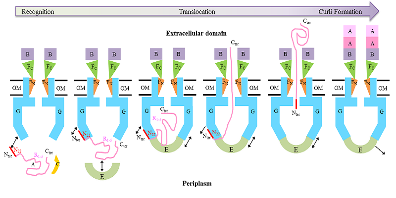 为了在宿主体内或者环境中更好的定植和生存,许多细菌选择聚集在一起形成由蛋白,核酸以及多糖形成的亲水基质包裹的封闭群落。这些由大量亲水大分子包裹的基质叫作生物被膜。细菌的生物被膜在很多感染性疾病中充当重要的致病因素,例如屏蔽型静脉导管,人工瓣膜感染性心内膜炎,以及Foley导管相关性尿路感染。curli菌毛作为生物被膜的重要组成部分,研究curli菌毛生成系统的组装和分泌机制对发展生物被膜相关疾病的治疗方法和治疗药物至关重要。curli生成系统由7个curli特异性相关基因(CsgA,CsgB,CsgC,CsgD,CsgE,CsgF和CsgG)组成,CsgA和CsgB是八型分泌系统的底物,CsgE,CsgF以及CsgG是分泌通道复合物的组成成分,负责特异性识别和分泌天然底物CsgA和CsgB。目前,对于通道复合物是如何组装以及底物CsgA是如何被通道复合物识别并分泌的机制并不清楚。