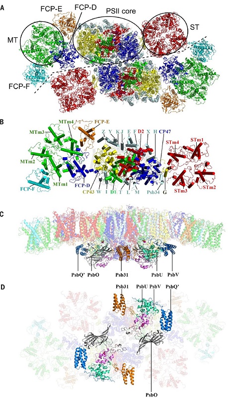 光系统II(PSII)是一个色素-蛋白超级复合体,它催化光诱导的水裂解反应,将太阳能转化为化学能,并释放出氧气。为了充分利用太阳能,光合生物进化出不同的捕光天线复合体(LHCs)用来捕获太阳能,并将能量传递给光系统II。捕光天线复合体II(LHCII)与PSII核心结合形成PSII-LHCII超级复合体。生活在不同环境处在不同光照条件下的不同进化路线上的光合生物有着复杂多变的LHCII。LHCII除了捕获光能之外,还有一个重要功能就是将强光照条件下吸收的多余的能量耗散掉,从而避免强光对光系统的损伤。
