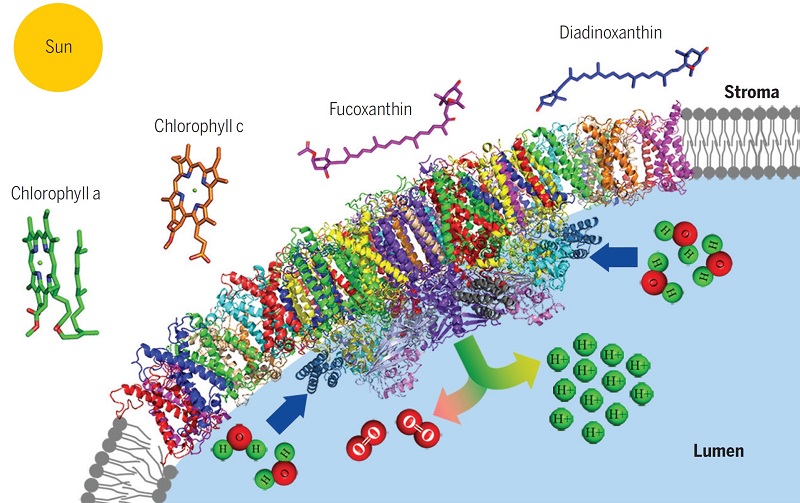 硅藻的适应性极强,除了空气和沙漠外,几乎所有的环境中都有硅藻,因此硅藻贡献了地球上每年原初生产力的25%左右(吸收二氧化碳的能力占全球生态系统的四分之一左右)。硅藻强大的适应能力依赖于其精致的细胞结构,高效的光合作用能力以及强大的光保护能力。硅藻的捕光天线系统主要结合叶绿素a/c和岩藻黄素(Fx),因此硅藻的捕光天线系统被命名为FCP,独特的捕光天线系统使硅藻在水下能高效的利用蓝绿光,同时还有极强的光保护能力 (图1)。