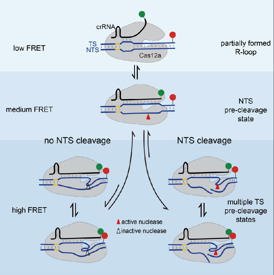 Cas12a蛋白(又称Cpf1)在哺乳动物的基因编辑中展现出了比Cas9蛋白更高的切割特异性。因此Cas12a切割双链DNA的分子机制受到了研究者的广泛关注。该研究利用单分子荧光共振能量转移技术,通过标记在crRNA和DNA上的荧光FRET对,来直接观测LbCas12a复合体在切割双链DNA过程中的动态构象变化,最终构建的定量动力学模型如图。首先,Cas12a/crRNA二元复合物识别靶标DNA序列,形成三元复合物,并在PAM序列近端开始形成R-loop(low FRET态)。随着R-loop的进一步延伸,Cas12a蛋白的核酸酶活性被激活,并且使得非互补链(NTS)从双链DNA结构解开,将切割位点暴露出来,以完成NTS链的切割(medium FRET态)。断裂的NTS链稳定了Cas12a复合体的互补链(TS)切割构象(high FRET态),以完成对TS链的切割。