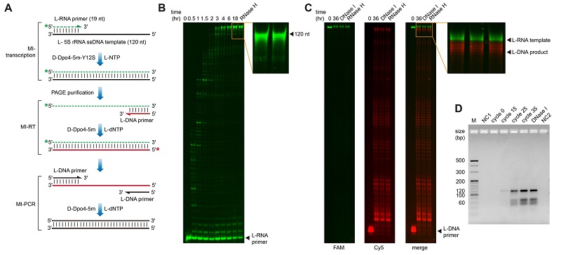(A) 基于Dpo4聚合酶的镜像转录与反转录系统示意图;(B) 利用镜像转录系统制备L型5S rRNA;(C) 以镜像转录产物为模板的镜像反转录反应;(D) 以镜像反转录产物为模板的镜像PCR反应。