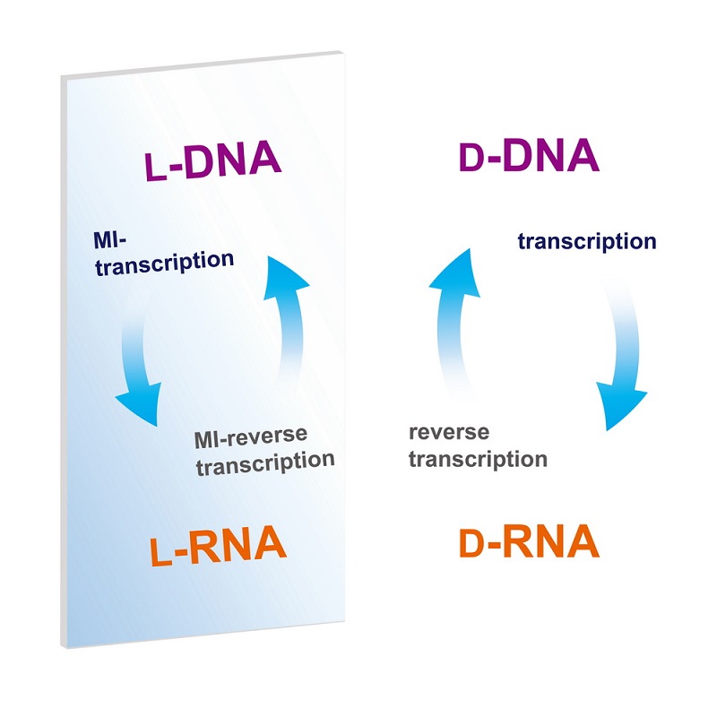 基于对上述生命起源及进化中手性选择问题的兴趣,朱听课题组致力于利用化学和分子生物学等多学科交叉手段构建由L型核酸和D型蛋白质组成的镜像生物学系统。此前已报道镜像DNA的复制、转录(Nat Chem, 8:698-704, 2016)、镜像PCR扩增(Cell Disc, 3:17037, 2017)、镜像DNA测序(Cell Chem Bio, 25:1-6, 2018)等多个系统。此次报道的镜像基因转录与反转录系统是构建镜像遗传信息中心法则的重要组成部分。