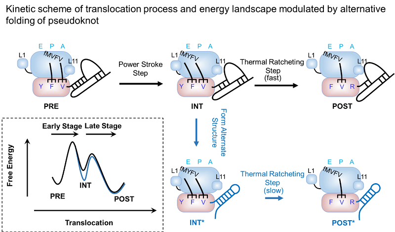 示意图: mRNA二级结构的构象可塑性调控核糖体转位过程的动力学模型