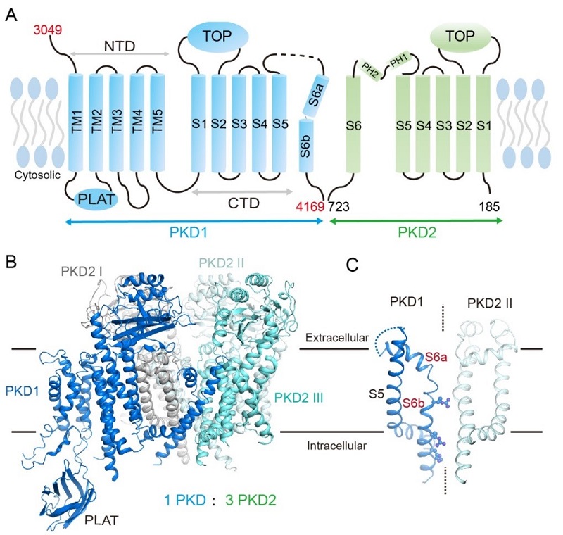 图1:A.人源PKD1和PKD2蛋白的拓扑结构示意图。B.人源PKD1和PKD2蛋白复合物结构;C.人源PKD1独特的通道结构域。