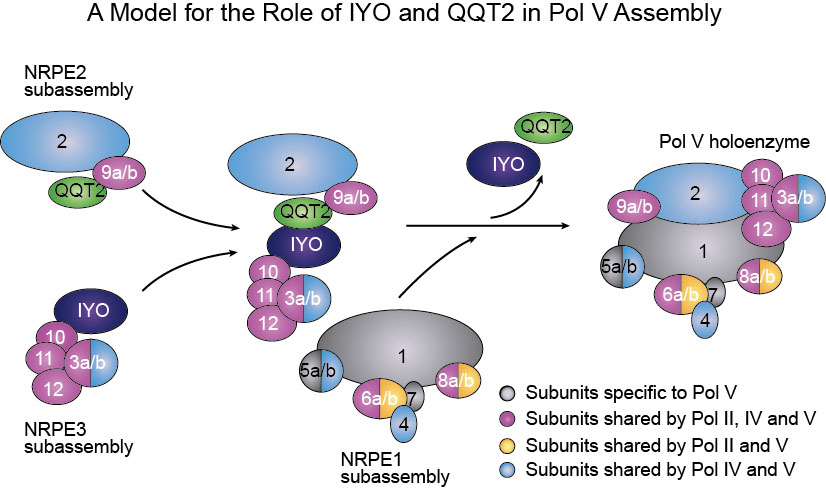 戚益军课题组通过正向遗传学筛选,获得了IYO,QQT2和NUCLEAR RNA POLYMERASE B11/D11/E11(NRPB/D/E11)的突变体。在这三个突变体中,siRNA,IGN RNA和DNA甲基化水平均有显著下降。通过免疫共沉淀和定量质谱实验发现,在iyo和qqt2突变体中,Pol V不能有效组装。进一步研究发现,IYO和QQT2与NRPE3组件互作并在NRPE3组件形成之后发挥功能,它们很可能起到连接NRPE3和NRPE2组件的作用。该研究还发现IYO和QQT2直接结合,并在与NRPE3组件互作时相互依赖对方。最后,该研究发现IYO和QQT2在Pol II和Pol IV的组装中也起重要作用。该研究首次报道了两个参与植物RNA聚合酶Pol II, Pol IV和Pol V组装的新因子,并揭示了Pol II, Pol IV和Pol V的组装机制。