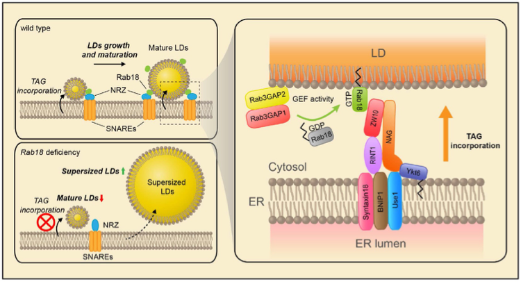 李蓬研究组发现Rab 小GTPase家族成员Rab18及其相互作用蛋白NRZ/SNARE能够介导脂滴-内质网接触位点形成,促进中性脂由内质网进入脂滴,进而调节脂滴的成熟与生长。在缺失Rab18的情况下,细胞中成熟脂滴数量显著减少,储存中性脂的能力下降,并伴随内质网应激(ER stress)的发生。与此同时,细胞中少数脂滴的增长速度却明显增加,最终导致“超大脂滴”的形成。研究从机制上发现,Rab18缺失并不影响新生脂滴的形成,而是抑制了新生脂滴的成熟与进一步生长。进一步研究显示,这是由于Rab18缺失抑制了甘油三酯从内质网向脂滴的转运导致的。Rab18通过直接相互作用,招募其效应因子NRZ复合体(NAG/RINT1/ZW10)到脂滴表面。NRZ复合体通过与内质网SNARE复合体成员Stx18/Use1/BNIP1相互作用介导内质网与脂滴的接触,从而促进甘油三酯从内质网向脂滴的运输。此外,研究还发现Rab3GAP1/2复合体作为Rab18的GEF促进激活Rab18并调控其脂滴定位以控制脂滴生长。