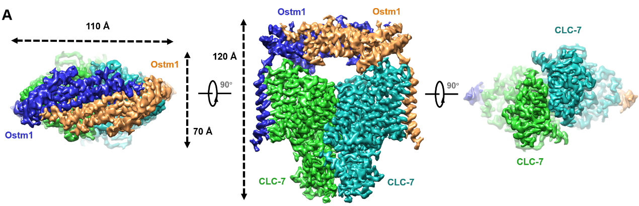 研究团队使用哺乳动物细胞系统表达纯化了CLC-7/Ostm1的复合物,并通过冷冻电镜第一次解析了CLC-7与辅助亚基Ostm1的复合物结构。CLC-7/Ostm1复合物结构显示高度糖基化的Ostm1在空间上像 “帽子” 一样位于CLC-7上方,并与CLC-7形成相互作用,