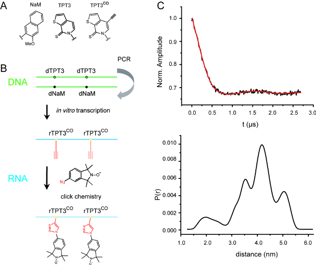 针对现有RNA位点特异性自旋标记技术的局限性,best365中国官方网站生命学院方显杨课题组利用包含NaM-TPT3非天然碱基对的系统,通过化学合成碱基带有炔基修饰的TPT3(rTPT3CO)(图1A),经过PCR和体外转录反应,在RNA中位点特异性的引入TPT3CO,进一步利用点击化学反应的高选择性,通过与叠氮基修饰的氮氧自由基化合物反应,建立了在非变性条件下长链RNA位点特异性自旋标记的策略,并被成功应用于长度为419核苷酸的核糖核酸酶RNAse P的位点特异性自旋标记中(图1B)。通过与美国南加州大学化学系Peter Z. Qin课题组合作,应用连续波(CW)EPR 技术证实了该方法的高标记效率、 研究了标记位点附近的动态特性、以及用双电子自旋共振(DEER) EPR技术测定了成对自旋中心间的距离(图1C)。该标记策略的成功建立将促进SDSL-EPR技术在长链RNA的结构与动态特性研究中的应用,并推动建立长链RNA的整合结构生物学研究方案。
