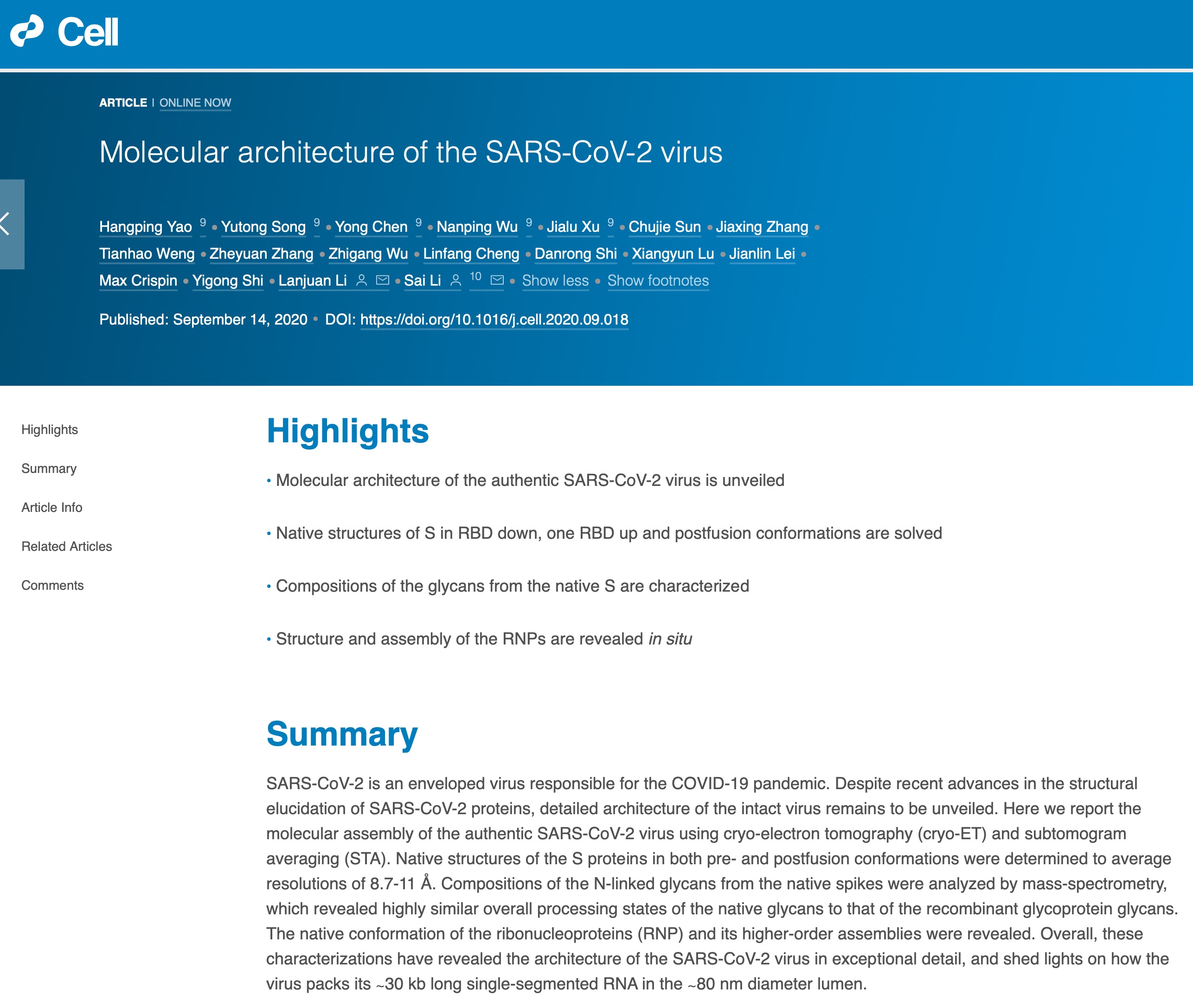 近日,best365中国官方网站生命学院李赛研究员课题组和浙江大学医学院附属第一医院传染病诊治国家重点实验室李兰娟院士课题组紧密合作,利用冷冻电镜断层成像和子断层平均重构技术成功解析了新冠病毒(SARS-CoV-2)全病毒三维结构,这一重要研究成果于北京时间2020年9月15日以 “新冠病毒的全分子结构”(Molecular architecture of the SARS-CoV-2 virus)为题在国际权威学术期刊《细胞》杂志上在线发表。