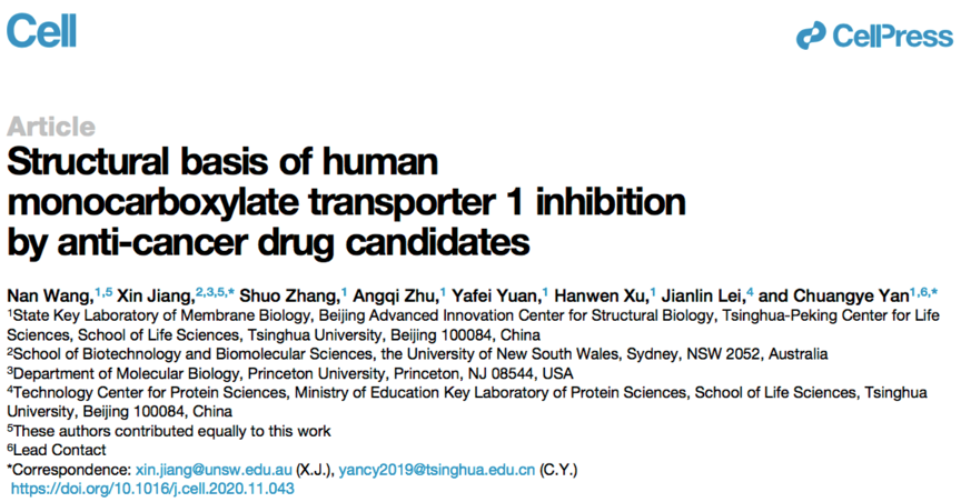 该项研究成果于2020年12月16日在线发表在生命科学领域顶尖杂志《细胞》(Cell)上,题为“候选抗癌药物对人源单羧酸转运蛋白抑制机理的结构生物学研究”(Structural basis of human monocarboxylate transporter 1 inhibition by anti-cancer drug candidates)。