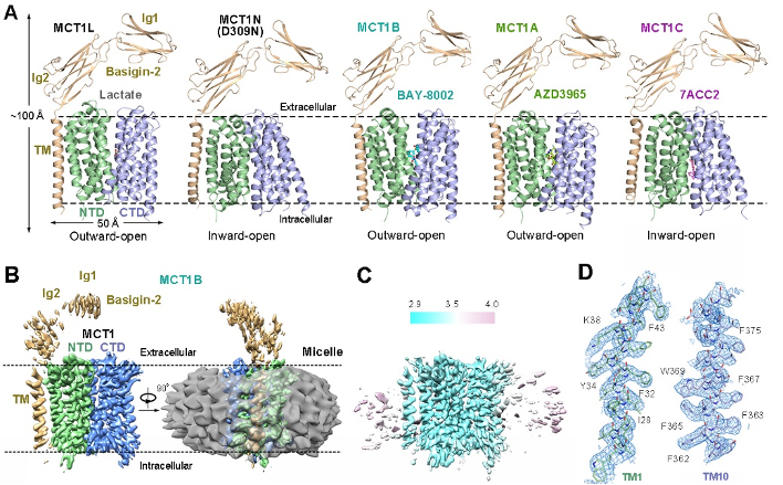 值得一提的是,MCT1/Basigin-2复合物没有对称性且分子量只有大约80kDa,并且胞外区域比较柔性,只有50kDa的穿膜区比较稳定(图2B),这对冷冻电镜的结构解析形成了巨大挑战。为了解决这些技术难题,研究人员设计了一种“降噪-再加权”(noise reduction and re-weighting methods)的新型数据处理方法,结合之前开发的“引导性多参照三维分类”(guided multi-reference 3D classification)方法,以及新发展的优选颗粒辅助三维分类策略(Seed-facilitated 3D classification)有效的消除了蛋白外的噪音信号,进一步突破了冷冻电镜解析非对称性膜蛋白样品的分子量下限,分辨率达到3Å(图2C、D)。这一方法将为进一步研究小分子量非对称性膜蛋白提供了新的思路。