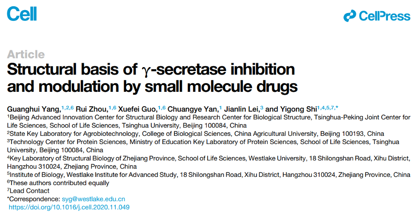 2020年12月28日,施一公教授团队在线发表“小分子药物抑制及调节γ-分泌酶的结构基础”(Structural Basis of γ-Secretase Inhibition and Modulation by Small Molecule Drugs)的文章[1],第一次报道了γ-分泌酶结合三种小分子抑制剂(Gamma-Secretase Inhibitor, GSI)和一种调节剂(Gamma-Secretase Modulator, GSM)的四个原子分辨率冷冻电镜结构,阐明了γ-分泌酶识别不同种类抑制剂及调节剂的分子机理。科研人员通过与2015年解析的γ-分泌酶的结构,以及2019年γ-分泌酶分别结合底物Notch与APP两种状态进行比较分析,首次完整展现了γ-分泌酶结合底物与药物的全过程,为了解γ-分泌酶活性调节机制提供了前所未有的精准蓝图,也将极大地推进下一代γ-分泌酶抑制剂及调节剂的设计与优化。