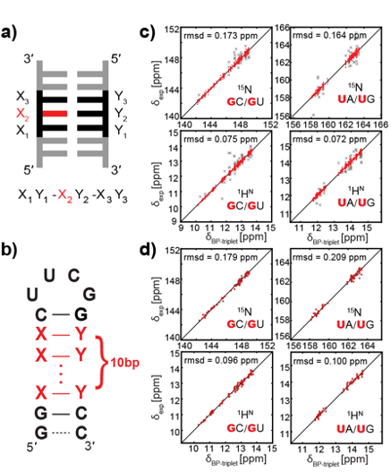 图1. a) “碱基对三联体”的定义;b) 发卡RNA的二级结构;c) 化学位移预测值与实验值的相关性(训练集);d) 化学位移预测值与实验值的相关性(测试集)。