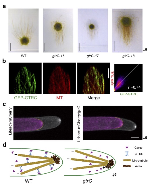 (a)黑暗中,野生型(WT)小立碗藓原丝体向上生长,gtrC突变体原丝体向下生长。(b)GTRC定位于原丝体顶端细胞的微管上。(c)重力刺激时微丝在顶端细胞中的分布。紫红色与灰色分别代表间隔30分钟的两个时间点下收集的荧光信号,两张图像的叠加展示了细胞的延伸方向。左图为野生型,右图为突变体。(d) GTRC参与苔藓原丝体向重力性调控的模型。原丝体偏离重力方向发生重力刺激时,GTRC沿微管向负端运动运输未知货物,导致微丝在顶端细胞的上侧聚集从而引起负向重力性向上弯曲生长;gtrC突变体中微丝则在下侧聚集,导致顶端细胞正向重力性向下弯曲生长。