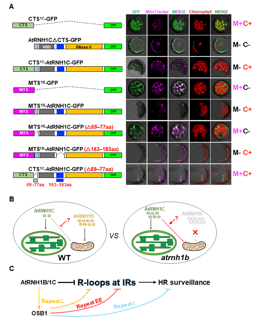 图(A):AtRNH1C在叶绿体和线粒体中的双重定位能力受其自身69-77aa序列抑制。