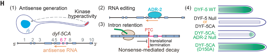 蛋白激酶不仅参与调控真核细胞的分裂、分化和代谢等生命过程,并且在多细胞生物的免疫监控和个体行为决定等生理过程中,发挥着至关重要的作用。精确的酶活性调控是蛋白激酶发挥正常生理功能的分子基础,已有的研究明确揭示:激酶活性的异常,是多种人类疾病发生的原因。因此,蛋白激酶活性调节的机制研究一直是生物学领域内的核心问题。纤毛是广泛存在于真核细胞表面的细胞器。纤毛驱动细胞运动并参与细胞对外界信号的感知,其结构和功能的异常导致35种多系统纤毛疾病。纤毛激酶DYF-5的人类同源基因MAK突变导致色素性视网膜炎(Retinitis Pigmentosa),然而到目前为止,仍不清楚MAP 激酶的活性调控方式以及其发挥生物学功能的机制。欧光朔实验室以线虫纤毛为研究对象,针对过度活化的蛋白激酶展开了研究,发现RNA编辑能够调控过度活化的纤毛激酶。