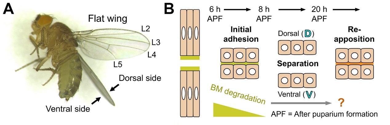 图1. (A) 野生型果蝇翅膀呈扁平状 (B) 不同发育时期下,果蝇翅膀贴合-分开-再贴合的示意图