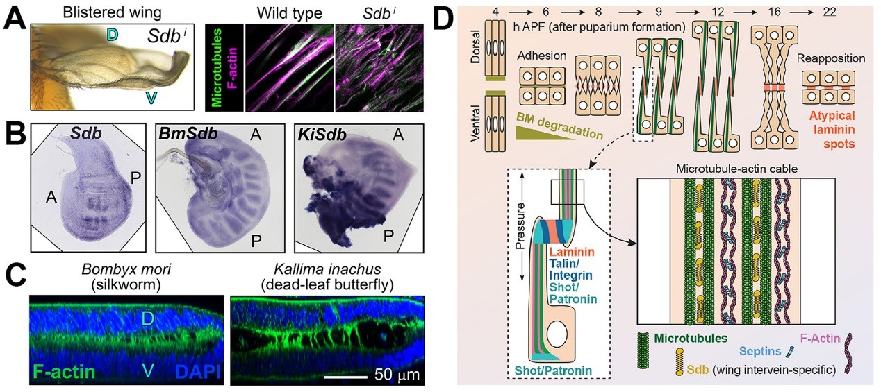 图4. (A) 微管稳定蛋白Sdb的缺失造成翅膀贴合缺陷和细胞骨架异常(Sdb, SAXO downstream of blistered) (B) 在果蝇、鳞翅目家蚕和枯叶蛱蝶幼虫翅膀中Sdb的表达分布(mRNA 原位杂交)(C) 鳞翅目翅膀中的细胞骨架突起连接 (D) 翅膀贴合过程中细胞骨架及各组分的作用
