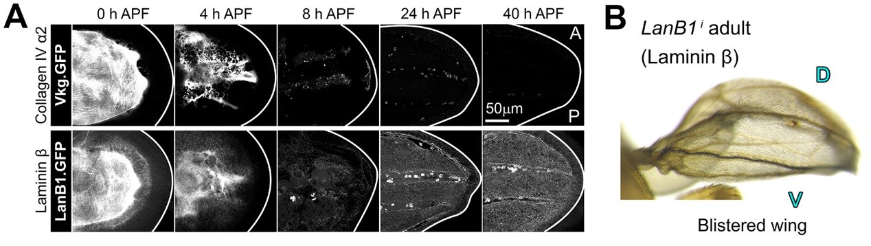 图2. (A) 层粘粘蛋白和胶原蛋白IV在翅膀发育过程中的表达情况 (B) 敲低层粘粘蛋白造成翅膀贴合缺陷 (鼓泡的翅膀)