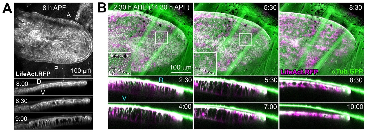 图3. (A) 细胞骨架突起的形成(结蛹后8-9小时, 8h to 9h APF) (B) 翅膀背腹两层细胞的再贴合过程(头部外翻后 2.5 小时至 10 小时,2.5 h to 10 h AHE;结蛹后14.5 小时至 22 小时,14.5 h to 22 h APF)