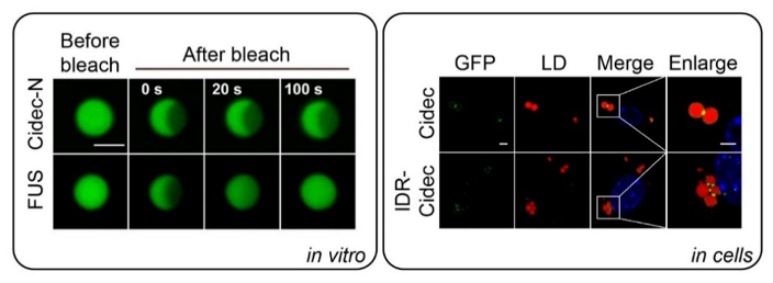 图1. 体外纯化Cidec-N-GFP和FUS-GFP液滴的荧光漂白恢复影像图;Cidec-GFP和hnRNPDL(IDR)-Cidec-GFP蛋白(绿色)在细胞内介导脂滴(红色)融合与成长的荧光图像。