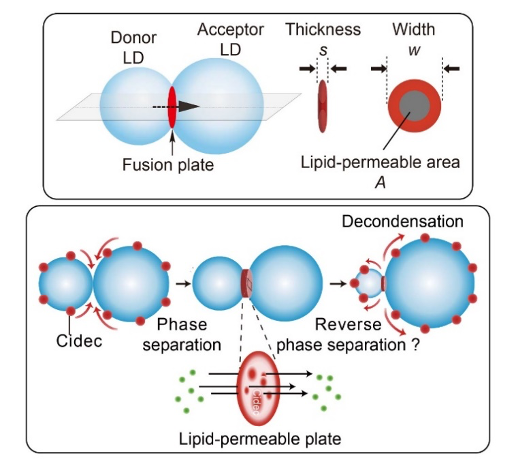图2. 脂滴融合圆盘的示意图及其形状特点;模型展示Cidec相分离与反向相分离介导脂质可渗透圆盘的组装与拆解