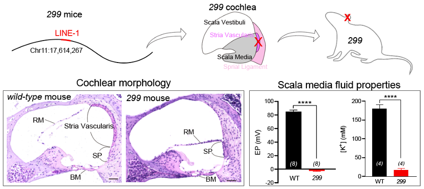 综上所述,作者鉴定了一株耳聋小鼠品系299的致病突变和致病机理,利用一系列技术和方法,包括听觉电生理、毛细胞电生理、组织学、在体蜗内电位记录、小鼠遗传学和转录组测序分析等,鉴定了L1是229小鼠的致病突变,血管纹组织发育障碍是299小鼠的致病机制。该研究首次报道了一株逆转座子在非编码基因区导致耳聋的小鼠,揭示了血管纹发育的过程,提示了可能的血管纹发育和功能相关新基因,为研究L1基因调控功能和血管纹发育和功能提供了新的动物模型。