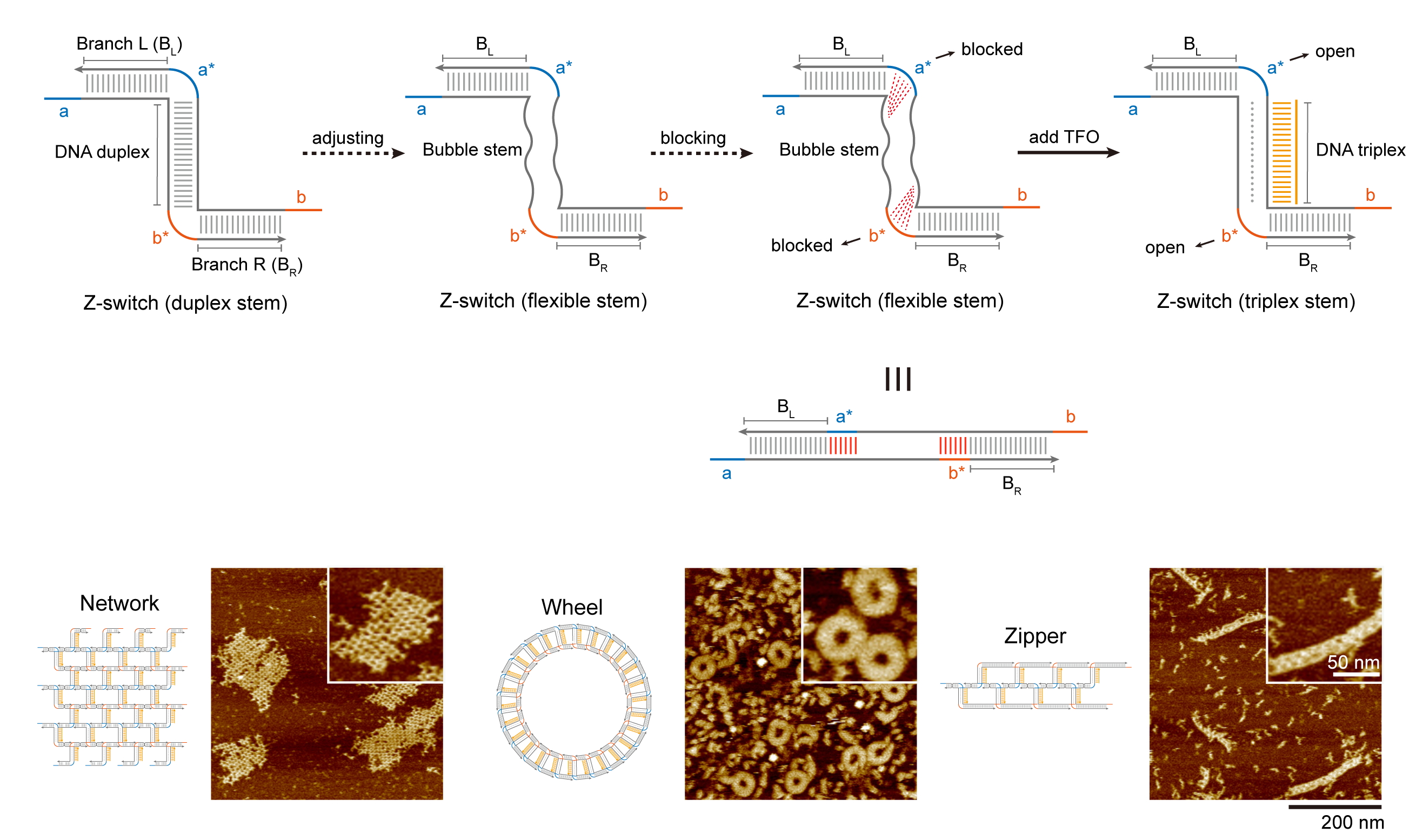 图 1. 基于三螺旋设计DNA 变构元件——Z-switch。 TFO链作为变构调节配体,可改变Z-switch的构象,调控活性位点a*和b*,从而调控Z-switch的自组装活性。这一模型经验证不依赖于特定种类的Z-switch,可进一步推广到其它种类的Z-switch。