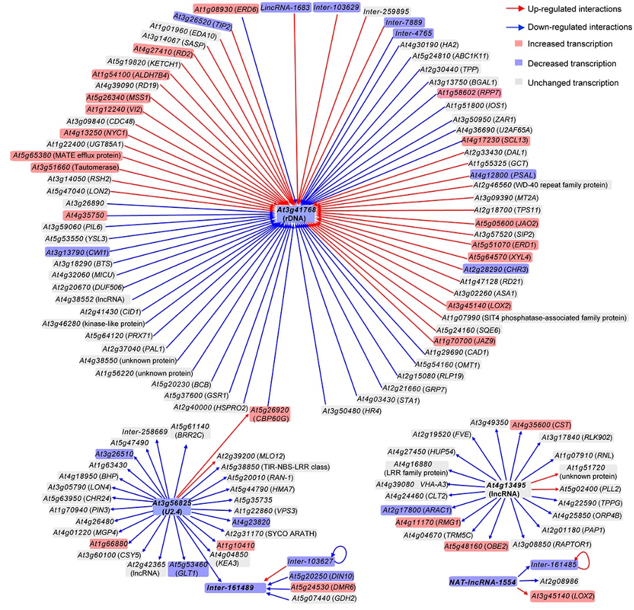 植物会遭遇各种各样的环境变化和胁迫挑战。由于不能移动,植物进化出了复杂巧妙的机制以适应和抵御各种环境胁迫。该研究进一步探索了RNA-染色质相互作用在植物响应胁迫中的变化及其功能。研究发现,大量RNA-染色质相互作用在植物受到生物胁迫(丁香假单胞菌,Pst DC3000侵染)和非生物胁迫(热处理)时发生变化。GRO-seq (Global nuclear Run-On sequencing)分析发现这些改变不依赖于RNA表达水平的改变,这意味着在植物响应胁迫过程中,RNA与染色质的结合可发生重新分布。非常有意思的是,发生变化的RNA-染色质相互作用形成了以特定RNA或染色质位点为互作结点的复杂网络,并且这些互作通常发生在胁迫响应相关的基因之间。例如,70多个RNA与rDNA位点(At3g41768)的相互作用在丁香假单胞菌侵染时发生改变,形成了以该rDNA位点为核心节点的大网络。在此网络中,涉及了25个抗病相关基因(如图)。这些发现表明:RNA-染色质的相互作用,可能对抗逆相关基因的协同表达起到重要的调控作用。