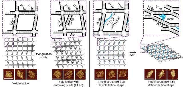 图2 基于角度控制支柱的四臂分支模块角度控制。左图:基于三角化支柱的松弛连接晶格的特定角度控制;右图:基于pH响应的三角化支柱(i-motif)的松弛连接晶格的动态角度控制。从上到下依次为:结构示意图、AFM图像。比例尺:100纳米