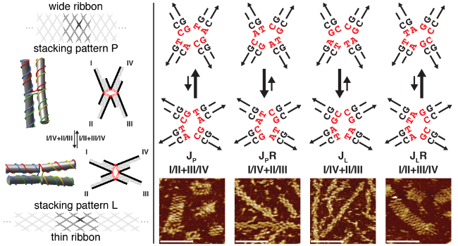 图1 基于分支点处的特定核苷酸序列的四臂分支模块方向控制。左图:分别由不同螺旋堆叠模式(P或L)的四臂分支模块构成的宽、窄带状结构示意图;右图:两组由具有特定分支点核苷酸序列的结构模块(JP与JPR,JL与JLR)构成的带状结构,从上到下依次为:特定分支点核苷酸序列及螺旋堆叠模式预测、AFM图像。比例尺:100纳米。
