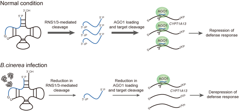 该研究最后阐明了其中一个丰度最高的5′ tsRNA,19-nt 5′ tsR-Ala的功能。发现5′ tsR-Ala能够与AGO1结合,并切割与其序列互补的靶标CYP71A13 mRNA,从而负调控CYP71A13基因的表达。CYP71A13编码植保素(植物产生的一种抗菌分子)合成途径中的一个关键酶。利用短串联模拟靶标(STTM)技术沉默5′ tsR-Ala,发现在5′ tsR-Ala沉默的植物中, CYP71A13表达上升,植保素含量增加,对灰霉菌抗性增强。特别有意思的是,研究发现植物在受到灰霉菌侵染时,包括5′ tsR-Ala在内的众多5′ tsRNA积累水平下降。