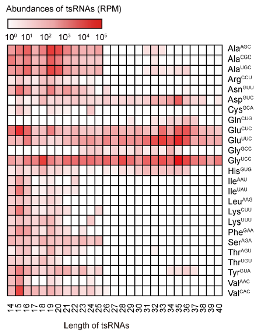 在这项研究中,戚益军课题组首先针对tRNA衍生小RNAs的特征,开发了一种基于RtcB连接酶的小RNA文库构建及测序方法(RtcB sRNA-seq),该方法能够同时捕捉并定量区分末端为3′羟基和3′磷酸/环磷酸的小RNAs。利用RtcB sRNA-seq,系统鉴定分析了拟南芥幼苗中5′ tRNA halves和5′ tsRNAs,发现80个tRNAs可产生近千个5′ tRNA halves和5′ tsRNAs,其中tRNA-Ala、tRNA-Gly和tRNA-Glu衍生的5′ tRNA halves和5′ tsRNAs丰度最高。tRNA-Ala主要产生19-nt的 5′ tsR-Ala,tRNA-Gly主要产生18-nt的5′ tsR-Gly和35-nt 5′ tRNA-Gly half,而tRNA-Glu则主要产生15-nt的5′ tsR-Glu和35-nt 5′ tRNA-Glu half(图1)。