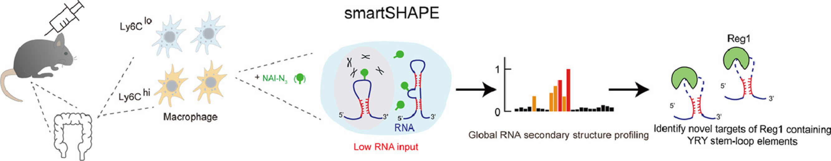 另外,巨噬细胞受刺激后表达一类细胞因子,编码这些细胞因子的mRNA 3’非编码区域存在含有YRY (R: A或G, Y: C和U)的茎环结构。该结构能够招募RNA内切酶Regnase-1迅速降解该基因,从而抑制免疫应答[3]。为了进一步系统性研究RNA结构在免疫应答过程中的转录后调控作用,研究人员开发了一套新的计算流程,利用巨噬细胞的smartSHAPE结构数据预测出上千个潜在YRY茎环结构,并通过一系列实验证明含有这些结构元件的转录本能够被Regnase-1调控,为进一步深入研究巨噬细胞RNA二级结构奠定了良好基础。