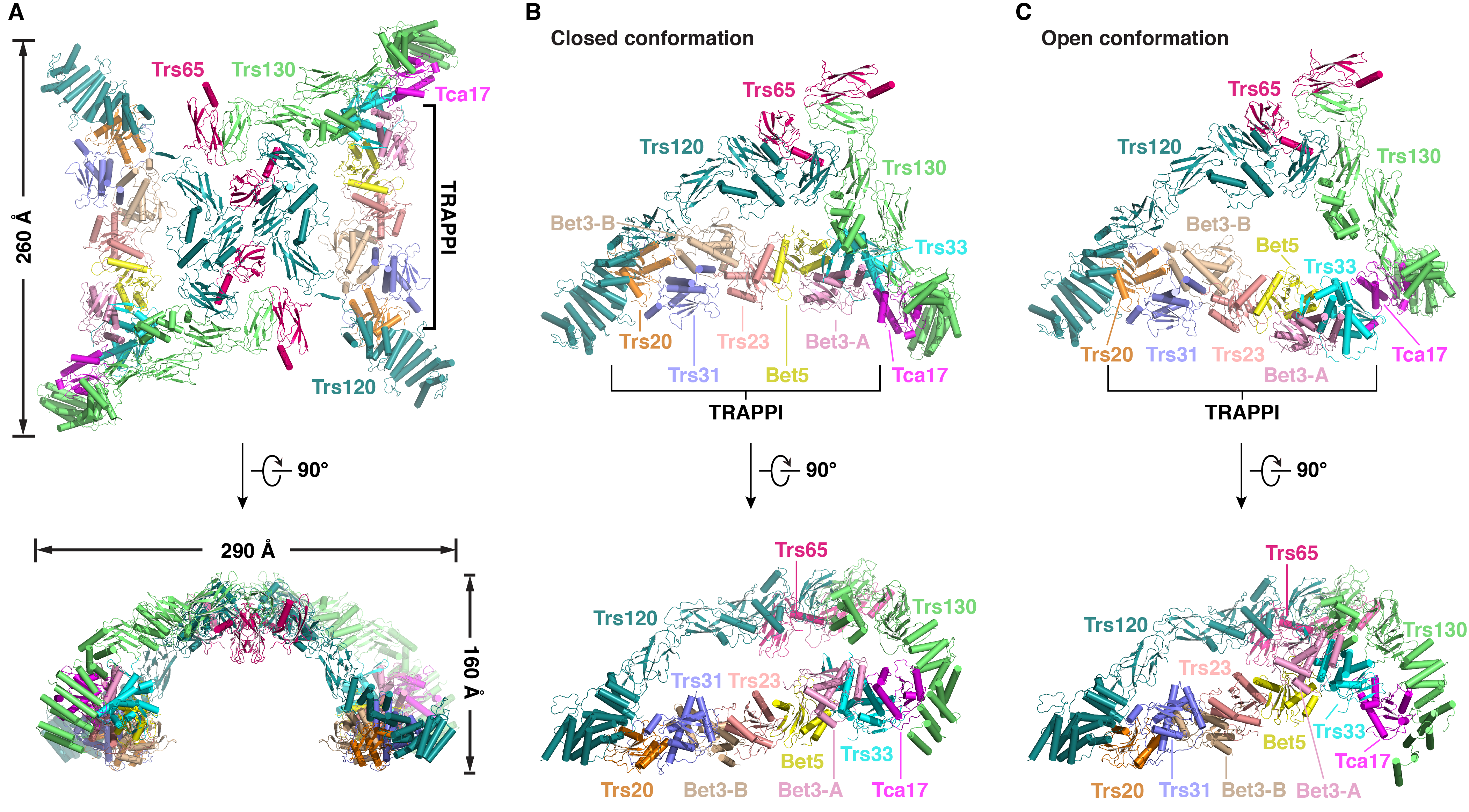 酵母TRAPPII复合体的结构。A,处于状态I的完整TRAPPII复合体的结构。B,闭合构象的TRAPPII单体的结构。C,开放构象的TRAPPII单体的结构。
