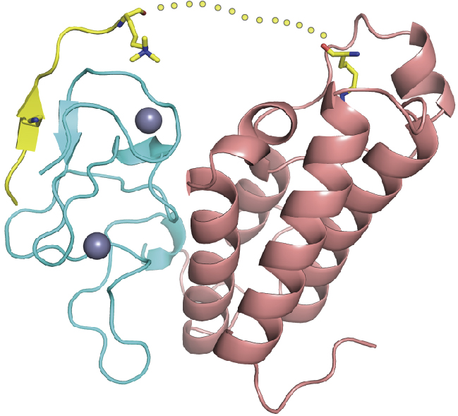 图3: TRIM66 PHD-Bromo结构域与带有H3K4-K9me3-K18ac修饰的肽段的复合物晶体。