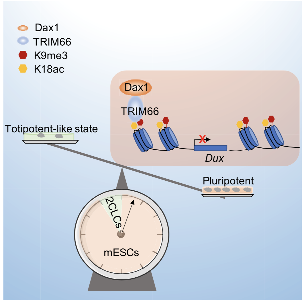 图1: TRIM66作为染色质H3K4-K9me3-K18ac阅读器和Dax1相互作用,通过抑制Dux1转录而阻碍类2细胞期细胞在小鼠胚胎干细胞中的数量。