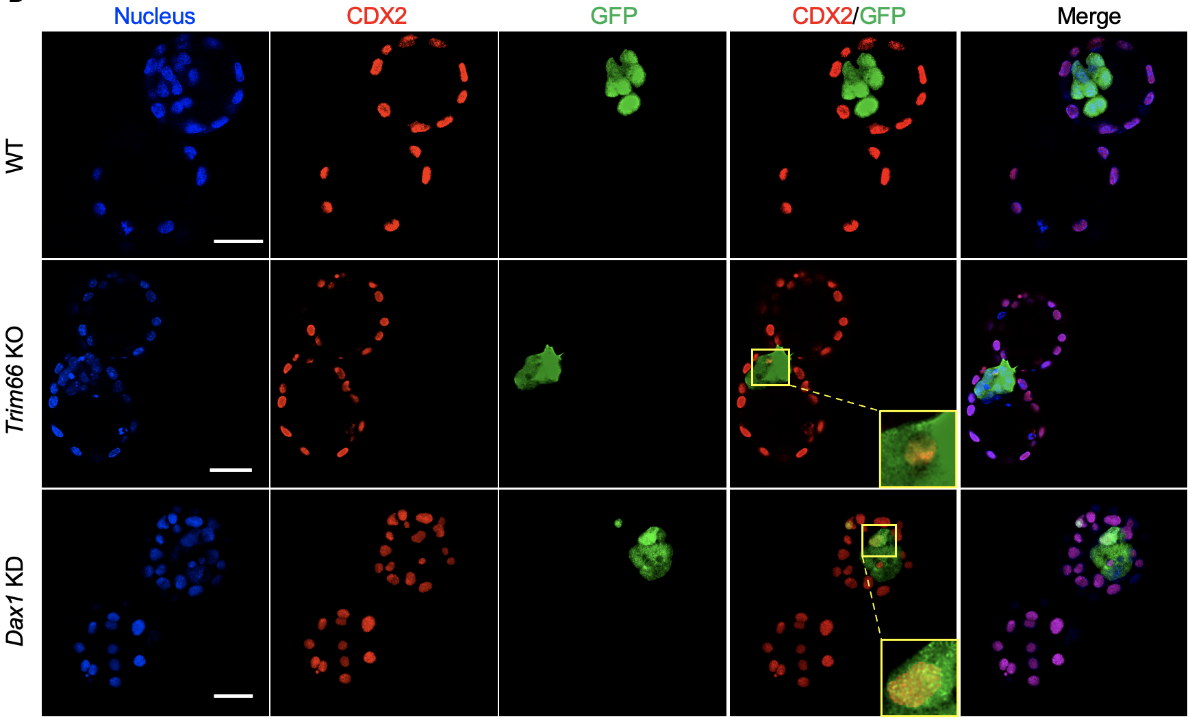 图2: 胚胎嵌合实验表明敲除TRIM66或敲低Dax1的小鼠胚胎干细胞具有产生滋养外胚层和胚胎组织细胞的能力。