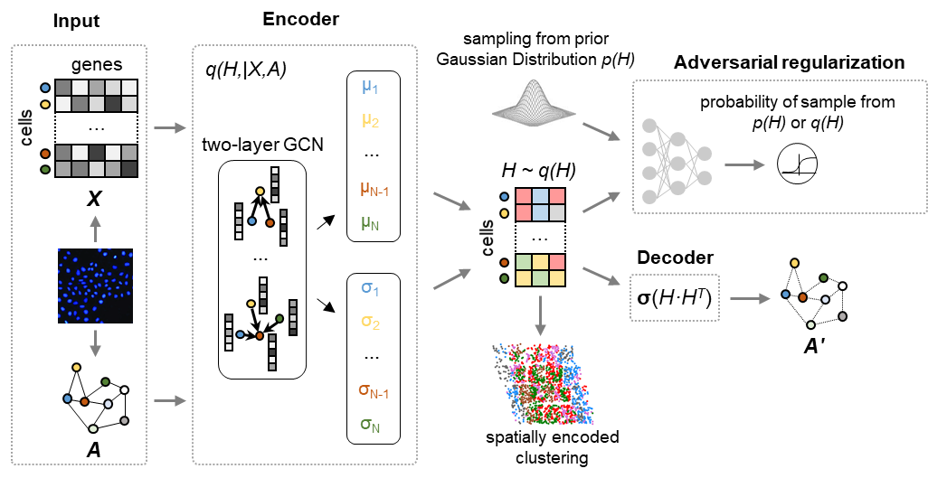 针对细胞互作关系的全面重构这一重要需求,杨雪瑞课题组首先提出理论假设:组织中空间上临近的细胞间应该富集了多种模式的互作与信息交流,而细胞内多维度分子特征谱图是细胞互作的驱动与调控因素,同时也反映了细胞组装与互作状态对细胞内生物学过程所产生的影响。因此,可以利用空间临近细胞的多维度信息,学习、挖掘细胞内分子特征与细胞间互作二者之间的内在关联。基于该理论思路,杨雪瑞课题组2018级博士生李润泽同学尝试了多种分析方法,最终使用新型人工智能策略,基于变分图自动编码器 (variational graph autoencoder, VGAE)开发了对单细胞空间转录组数据的深度学习框架方法DeepLinc。