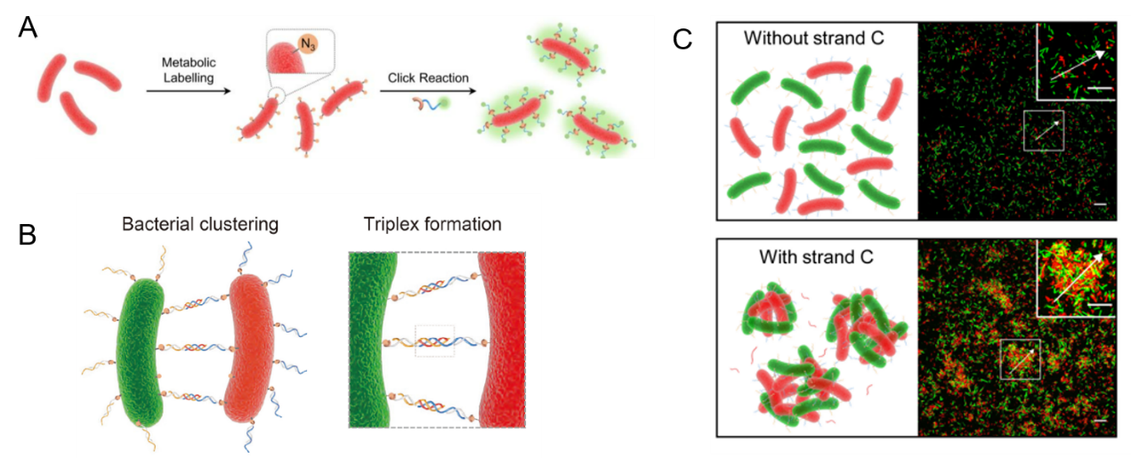 图4 DNA三螺旋介导的细菌组装过程。(A)通过代谢标记和点击化学的方式在细菌表面标记DNA。(B)三螺旋介导的细菌自组装示意图。(C)三螺旋介导的细菌自组装共聚焦显微镜图像结果