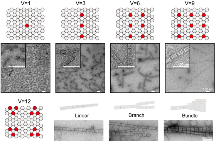 图2 基于DNA折纸结构的三元相互作用。通过改变作用位点的数目实现DNA折纸结构价态的精确调控,组装出越来越长的纳米纤维结构。当价态进一步增加又可以得到更多的高级结构。