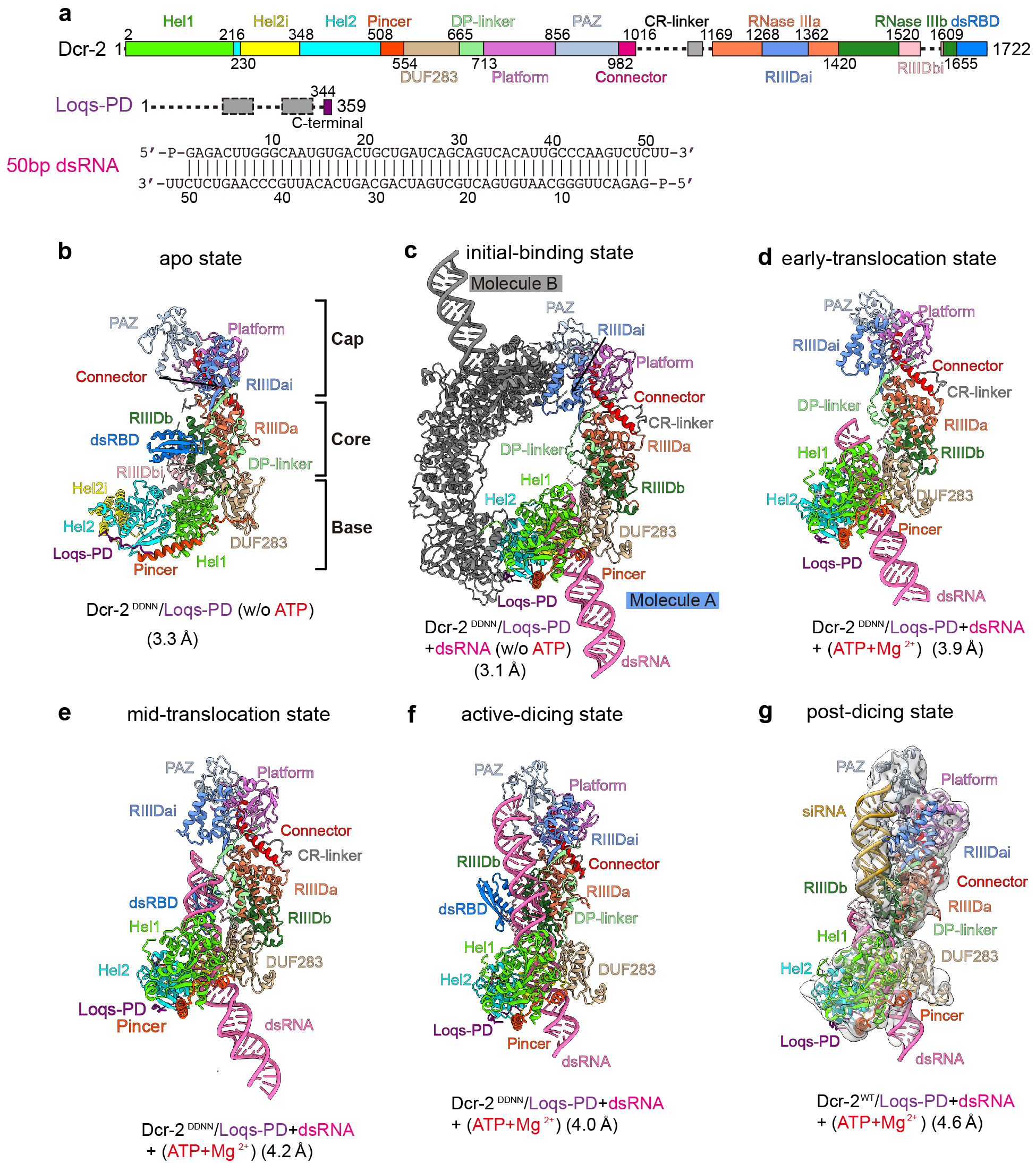 研究团队从活性位点突变的Dicer-2/Loqs-PD单独蛋白(apo)复合物结构开始解析。之后加入了双链RNA,获得了无ATP时,处在初始结合状态的Dicer-2/Loqs-PD–dsRNA复合物高分辨结构。发现在apo状态下松散的解旋酶结构域在初始结合状态中像手一样包裹住了双链RNA并扭曲了RNA的轴,此时解旋酶中的Hel1与Hel2亚结构域组成了成熟的ATP结合位点。在该状态下还明确了Loqs-PD主要通过C端与Dicer-2的解旋酶区域紧密结合的分子机制。在初始状态的基础上,进一步加入ATP和镁离子,通过数据收集与计算分类,得到了切割活性状态与两种明显具有不同结构特点的移位状态;与初始状态比较,两种移位状态中的Dicer-2–Loqs-PD复合物分别在双链RNA上移动了8bp和17bp左右,其中早期移位状态(~8bp)可以看作是在初始状态上的延伸,而中期移位状态(~17bp)中由于双链RNA穿过解旋酶的长度足够长,使得Dicer-2 C端的dsRBD结构域能够结合双链RNA,并对RNA的轴进行了进一步的偏转,使其指向能够识别末端PAZ-Platform结构域,RNA进一步的深入会使得其末端结合到PAZ-Platform结构域。之后,随着ATP水解导致的RNA进一步的深入、形变,从而产生的力使得解旋酶结构域以外的区域(cap-core区域)作为一个整体被RNA撑开,RNA进一步深入,最终到达切割活性状态,cap-core区域则紧密的结合在双链RNA上,确保精确的21bp siRNA的生成。之后研究者们使用正常活性的Dicer-2蛋白,获得了处于切割后状态的复合物,并通过分析发现它处于完成切割后正在回复到的早起移位状态的过程中。从而将整个过程串起,阐明了Dicer-2–Loqs-PD复合物从结合双链RNA并在其上移动,到形成切割活性状态,直至切割完成产生siRNA的整个循环过程的分子机制和其中连续且递进的构象变化。
