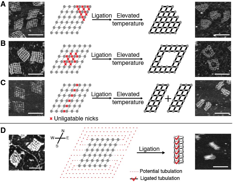 在提升结构稳定性的基础上,作者利用DNA连接酶实现DNA纳米结构内碱基配对状态在稳定(“ON”)和不稳定(“OFF”)之间转换,以完成结构的动态重构。如图3所示,一方面,通过设置缺口位点处是否磷酸化,可以使DNA纳米结构在DNA连接酶的处理下,显示出响应温度信号的形态变化;另一方面,通过调整粘性末端配对的长度,在DNA连接酶的作用下,可以将平片DNA纳米结构转换成管状立体结构。在原子力显微镜下,以上动态重构被成功展示。
