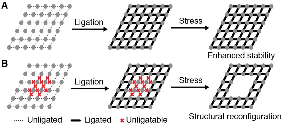 在DNA纳米技术领域,得益于其可编码性和可寻址性,多样而复杂的DNA结构展示出纳米尺度上的多种可能性。特别是在以DNA自组装为基础的动态变构领域,存在许多种动态调节纳米结构的方法,如由链置换反应介导的或酶-DNA互作介导的动态变构效应,从而衍生出巧妙独特的可行使特定功能的动态核酸结构工具,如纳米机器人等。在本研究中,本文作者构建了一种基于DNA连接酶与DNA纳米结构相互作用的自定义可编码平台,利用DNA连接酶有效地增强纳米结构稳定性的基本特点,通过区分结构内可酶连(ligatable)与不可酶连(unligatable)部分在酶连处理后响应外界刺激时稳定性的差异,从而提出了DNA连接酶诱导DNA纳米结构实现动态重构的方法(图1)。