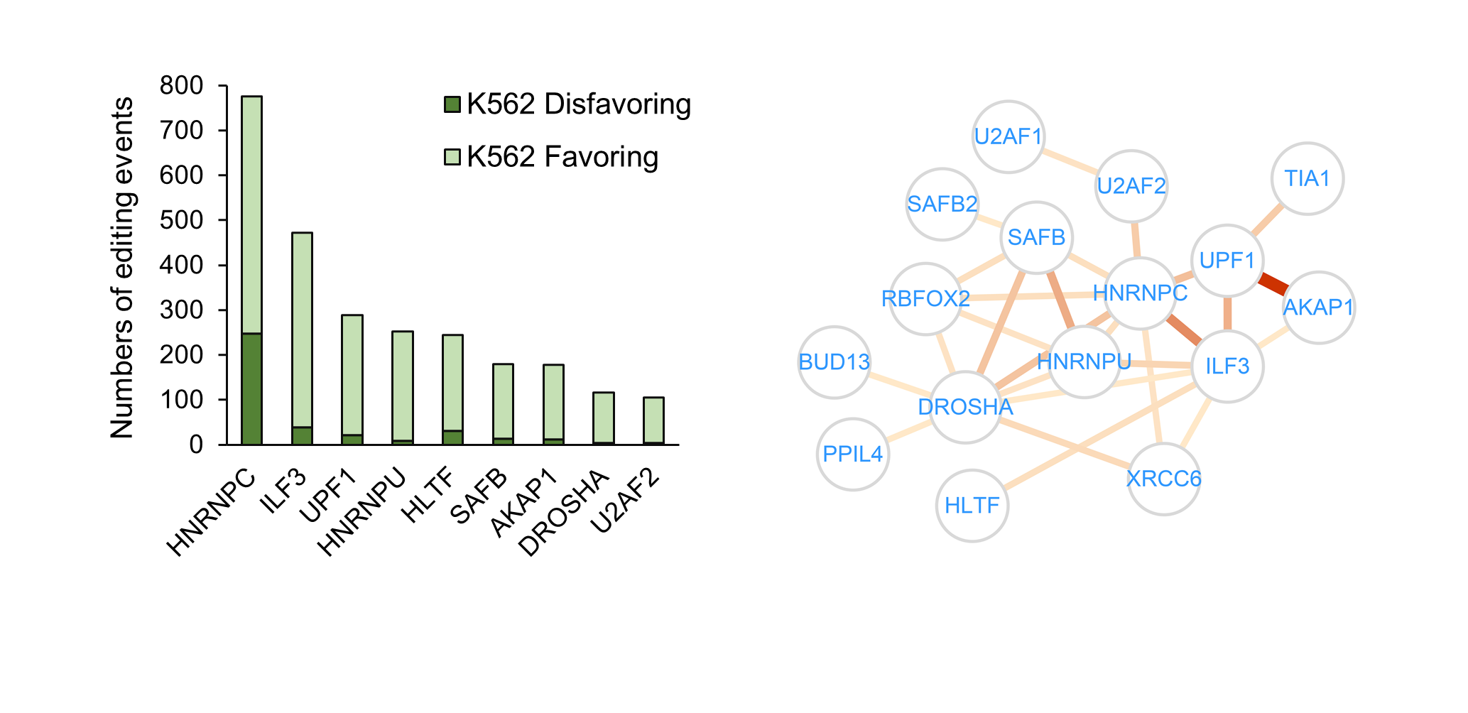 图示:人白血病细胞系K562中多个RBP与RNA编辑位点的结合偏好性分析(左);基于RBP-RNA编辑互作关系构建的RBP功能关联网络。
