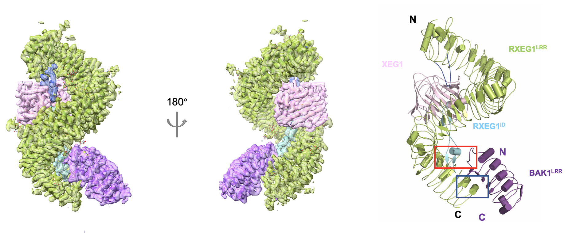 研究发现RXEG1主要通过胞外N端帽子和C端岛区形成的两个独特的loop结合XEG1。通过对RXEG1单独冷冻电镜结构和受体-配体识别(RXEG1-XEG1)晶体结构的比较,发现XEG1的结合引起了RXEG1岛区及C末端的构像发生明显的变化,这种改变诱导共受体BAK1的结合并进一步稳定RXEG1岛区和C端4个LRR基序的构象变化。受体-配体-共受体活化复合物(RXEG1-XEG1-BAK1)结构显示XEG1并不直接参与RXEG1与共受体BAK1的互作,而是通过别构效应间接促进RXEG1与BAK1的异源二聚化。体内生化和功能分析也明确了XEG1诱导RXEG1岛区构象改变进而诱导BAK1结合形成异源二聚体来激活下游免疫信号通路的分子机制。