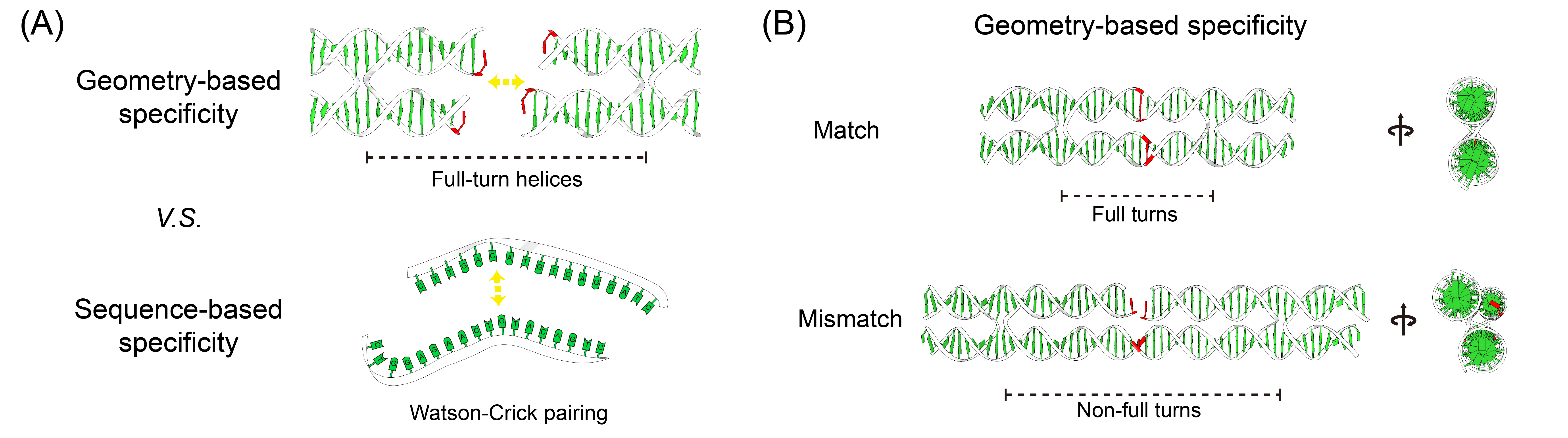 图 1. 基于几何构型的DNA分子特异性识别。 (A)依赖几何构型的特异性识别方式与依赖于序列互补的特异性识别方式之间的对比。(B)在依赖几何构型的特异性识别方式中,只有当两个粘性末端之间满足特定的几何构型要求时才会发生结合;当两个粘性末端之间没有满足特定的几何构型要求时,不会发生结合。