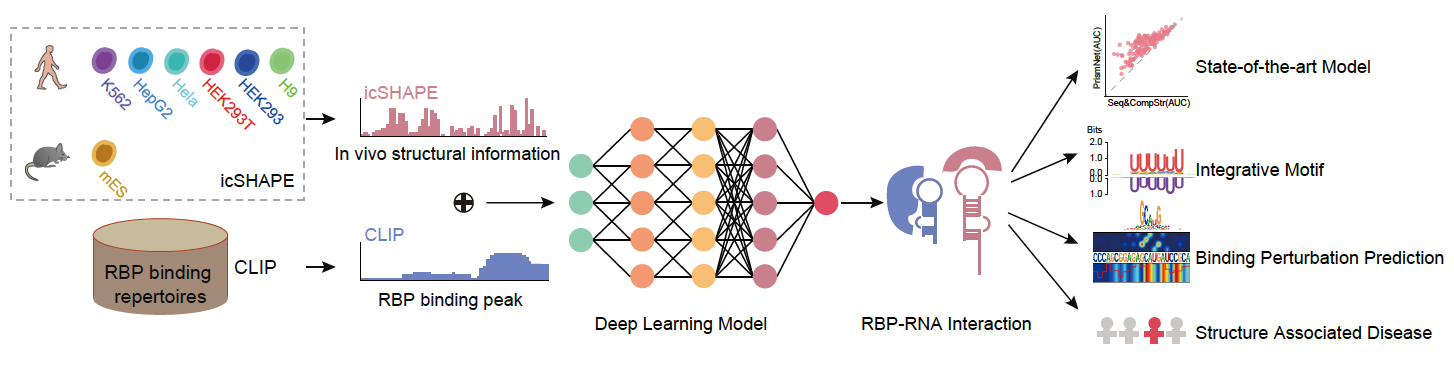 RNA结合蛋白(RBP)在RNA转录、RNA代谢以及RNA翻译过程中起重要的调控作用。解析RBP在不同的细胞环境下的结合图谱对于理解RBP的功能及其调控机制具有重要意义。然而,受限于现在的通用实验手段(CLIP),通常只能解析在某些特定细胞环境下特定RNA的结合位点,我们对于多种细胞环境下大量RBP的结合图谱并不十分清楚。而现有的预测RBP结合位点的计算方法原则上都是基于RNA序列,无法解决RBP在不同细胞环境下具有结合动态性的问题。为了解决这一难题,在本工作中,张强锋研究组通过整合细胞内RNA结构信息以及对应细胞系的RBP结合信息,利用多层残差神经网络,构建了预测RBP结合位点的PrismNet模型。该模型在168个人类RBP数据上进行训练学习,预测准确率显著高于之前仅仅利用RNA序列以及基于序列预测RNA结构方法的模型。